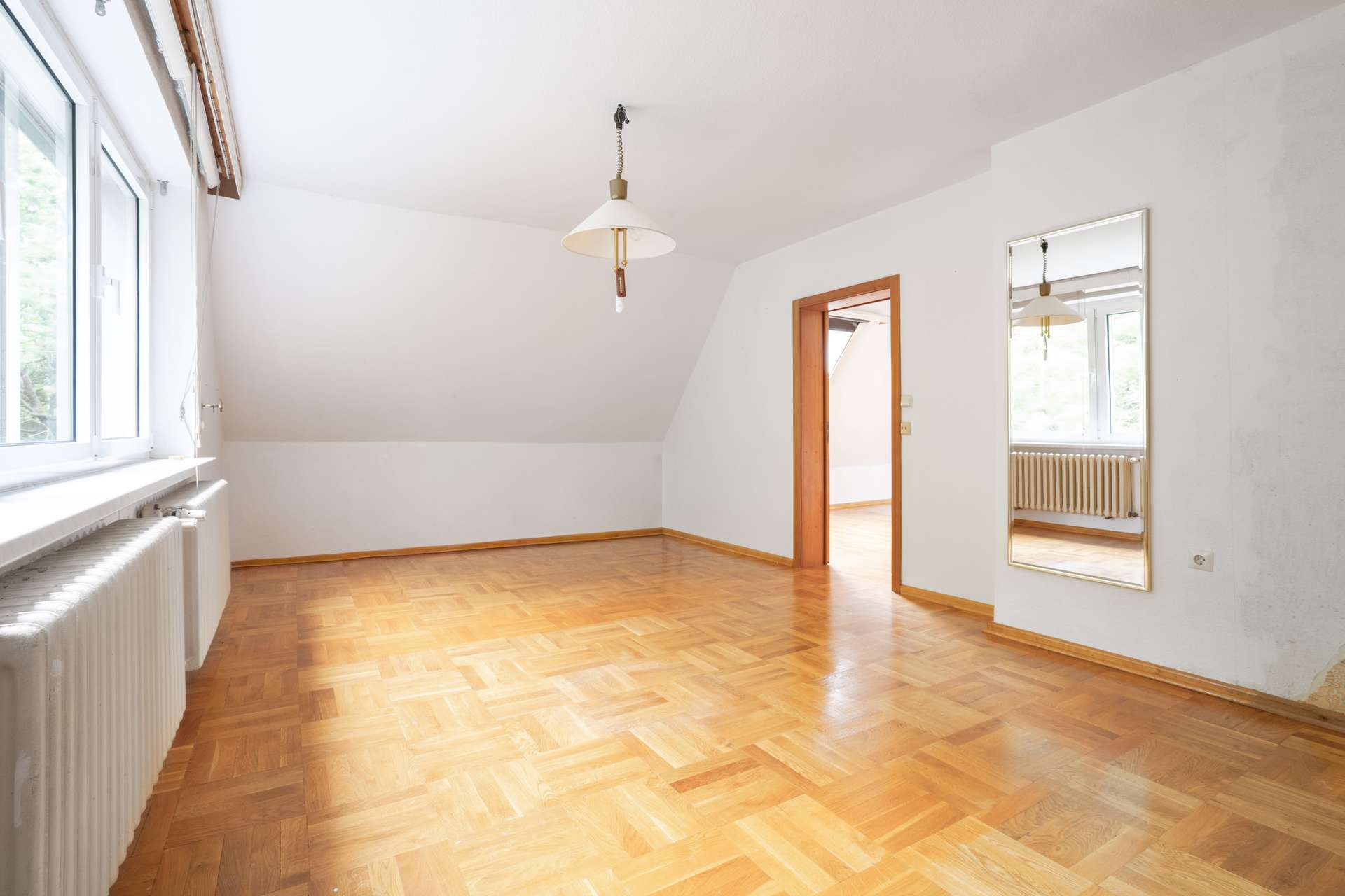 Die sechs Zimmer sind durchdacht geschnitten, insbesondere im Hochparterre, wo die Wohnräume modern proportioniert und von großen Fensterflächen geprägt sind. Der offene Kamin sorgt hier für eine behagliche Atmosphäre – seine Schieferverkleidung speichert die Wärme und gibt sie noch lange ab. Die gut erhaltenen Parkettböden verleihen dem Haus zusätzlich Charakter und unterstreichen die wohnliche Ausstrahlung.