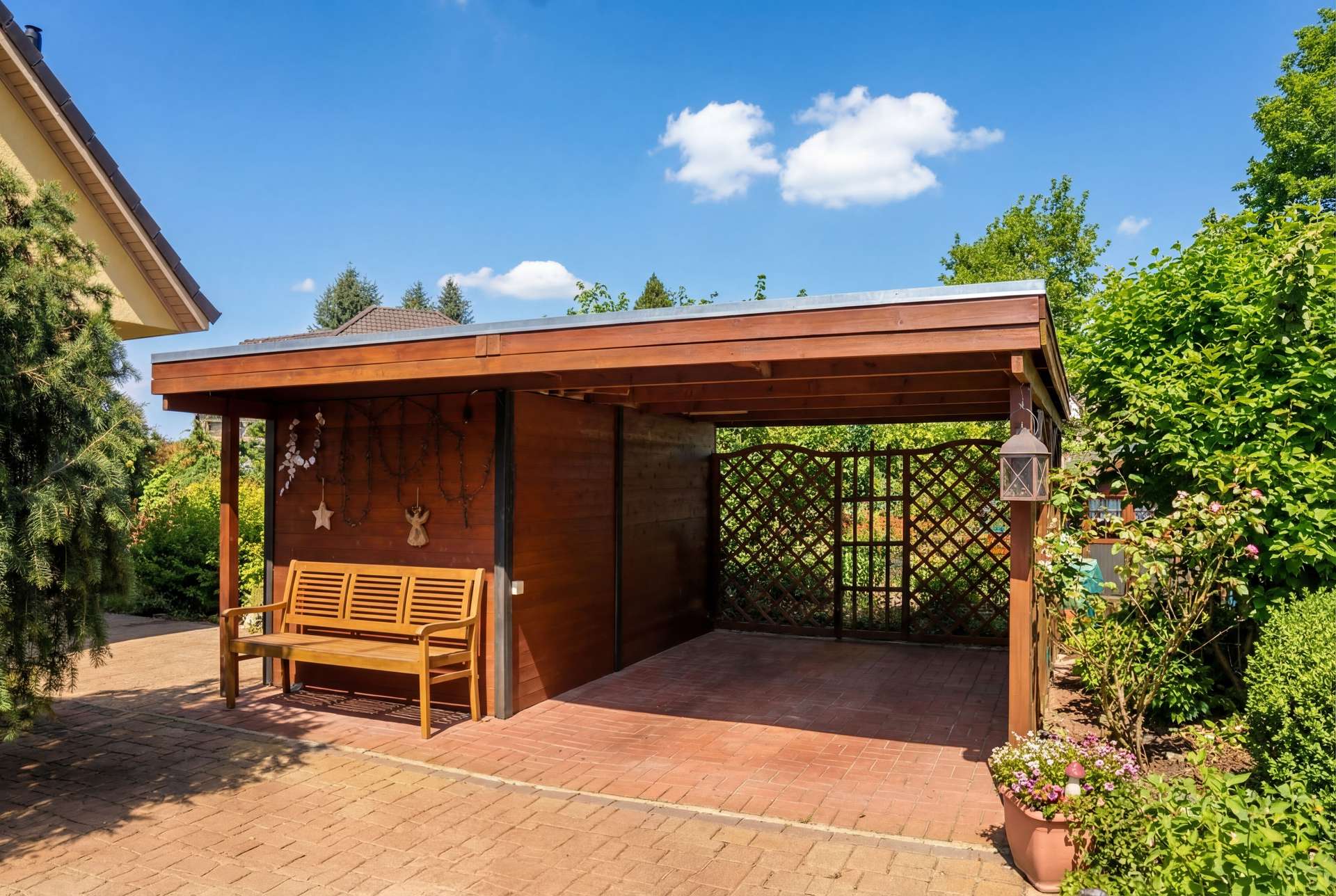 Der offene Wohn- und Essbereich bildet das Herzstück des Hauses. Große, bodentiefe Fenster schaffen eine angenehme Verbindung zwischen Innen und Außen und lassen viel Tageslicht herein. Von hier aus gelangt man direkt auf die sonnige Terrasse. Der Garten präsentiert sich als ruhiger Rückzugsort – ein Ort zum Entspannen, Genießen oder für gesellige Stunden im Freien. Ein kleines Gartenhäuschen bietet zusätzlichen Stauraum oder Raum für Hobbys, während das Carport eine praktische und stilvolle Ergänzung darstellt.